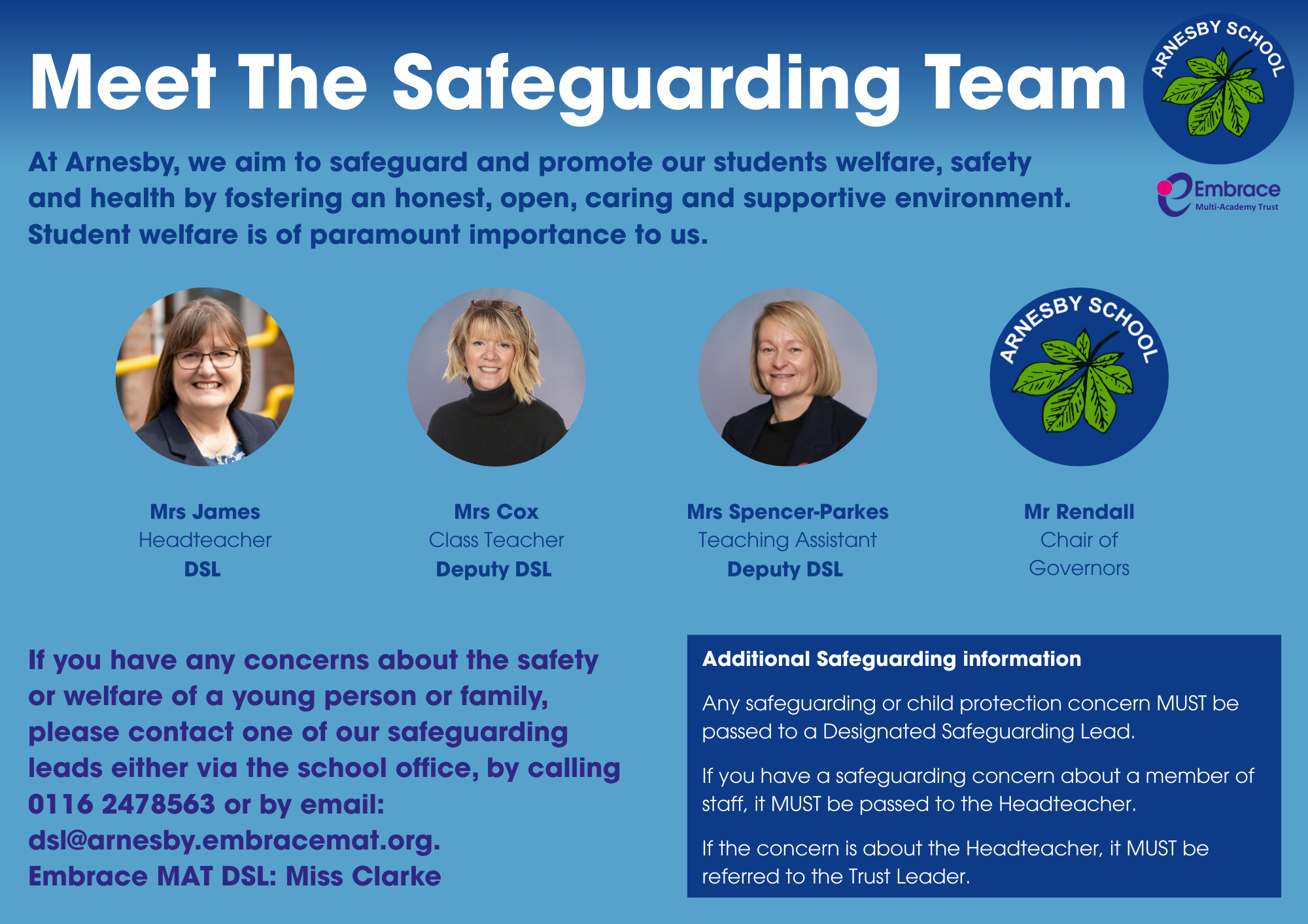 If you have any safeguarding concerns about a child please speak to Mrs James, Mrs Cox or Mrs Spencer-Parkes on 0116 2478563 or by email: dsl@arnesby.embracemat.org.